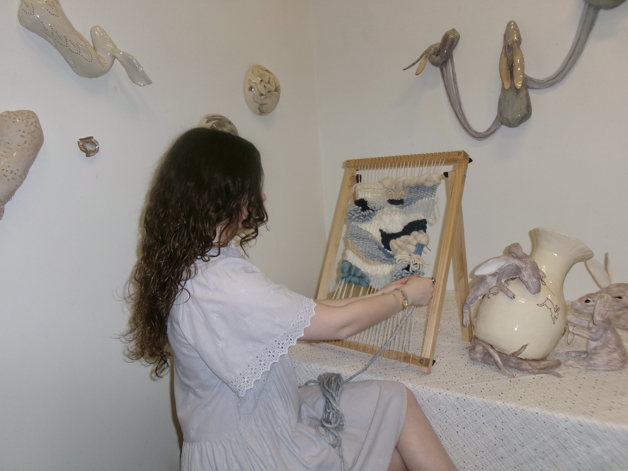 While working towards her BA, Hailey studied many mediums, typically charcoal drawings or clay sculpting, where she focused on psychological processing. While still focusing on mental processes during her MFA program, she began to focus more on the drift between the conscious and unconscious and the reminiscence through memories. Her current work heavily depicts photo-realistic drawings of old film portraiture and ceramic vessels layered with fibers such as embroidery and crochet.